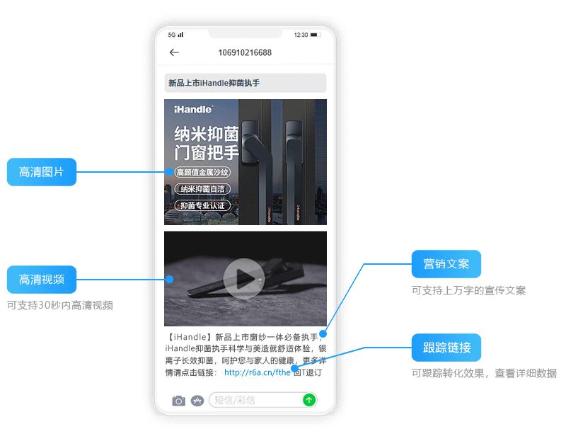 5G视频短信是5G通信技术的一种代表性的应用;可同时承载1.8M的文字、图片、音频、视频等富媒体内容,让企业能够更丰富全面的展现传达的内容;用户无需流量、不用安装即可接收,丰富了短信的应用场景,为企业带来更多的机遇。